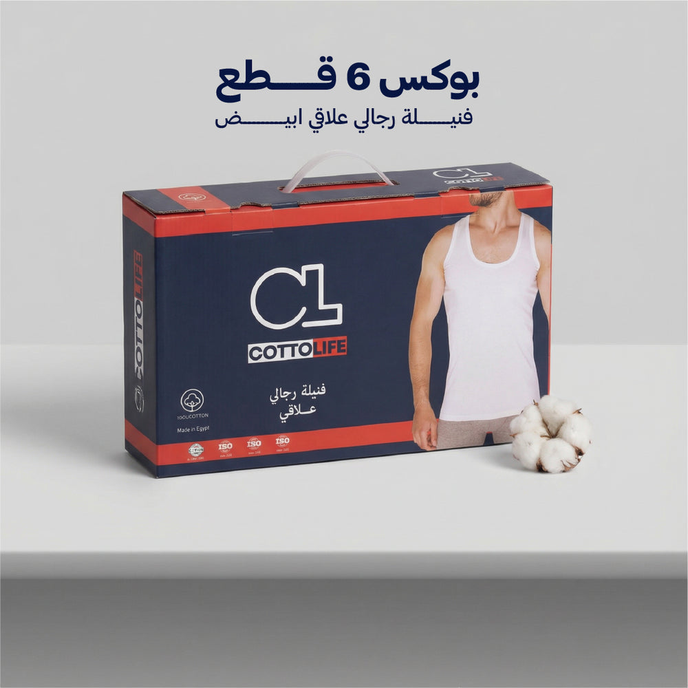 بوكس 6 قطع فنيلة علاقي رجالي ابيض قطن مصري عالي الجودة ، صناعة مصرية